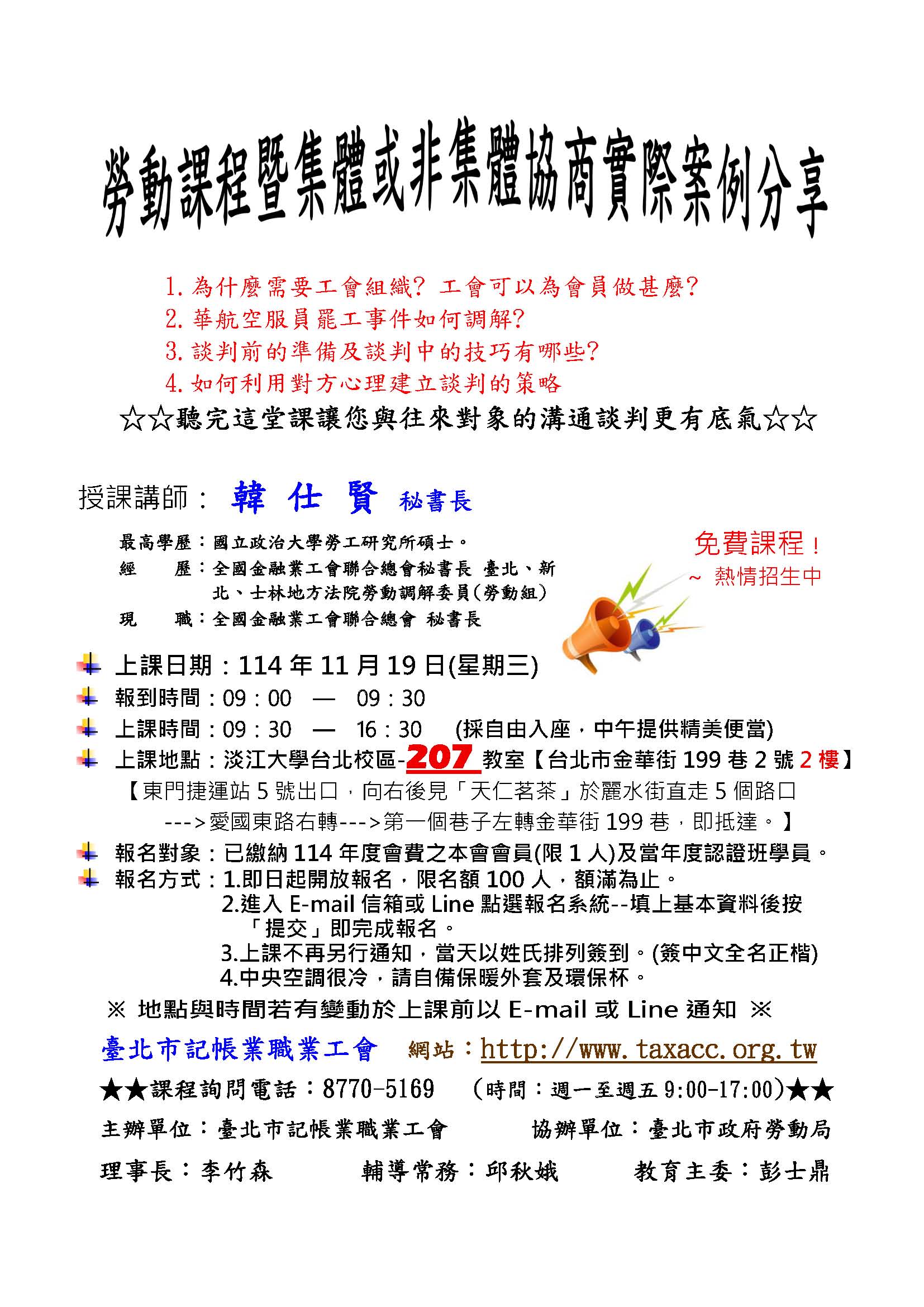 114年11月19日免費課程---韓仕賢老師主講 『勞動課程暨集體或非集體協商實際案例分享』