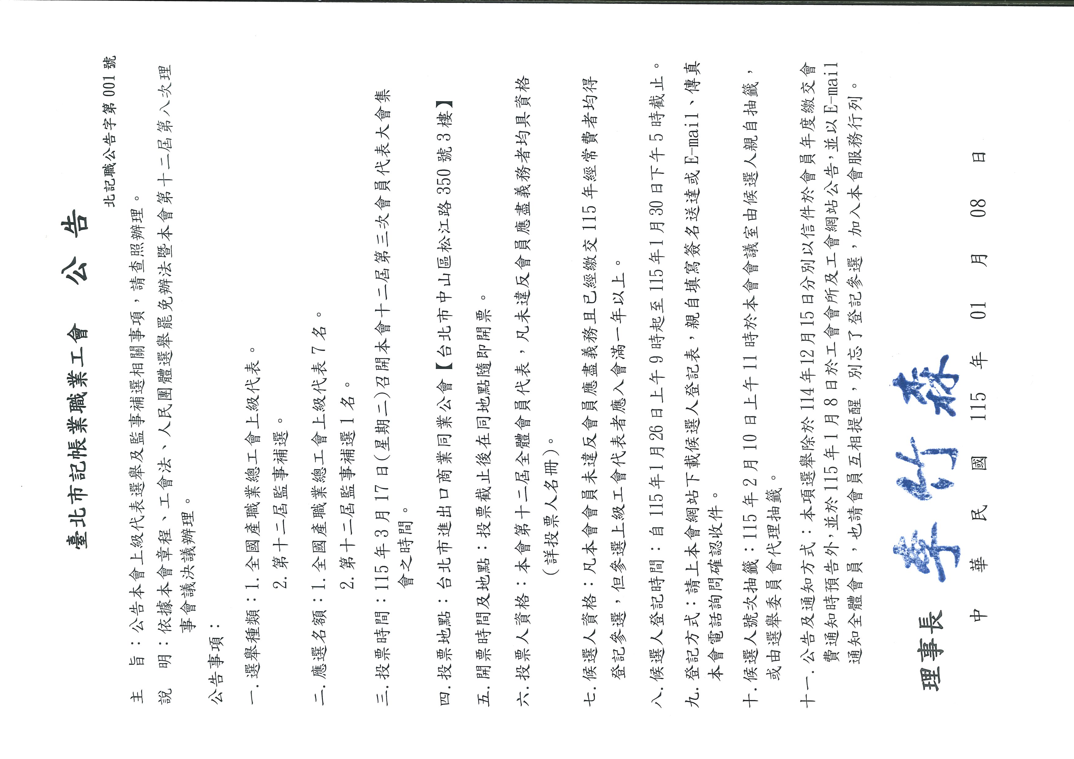 親愛會員您好:本會上級工會代表候選及監事補選登記日期:自115年1月26日上午9時起至115年1月30日下午5時截止。登記方式:請上本會網站下載候選人登記表,親自填寫簽名送達或E-mail、傳真本會電話詢問確認收件。候選人號次抽籤:115年2月10日上午11時於本會會議室由候選人親自抽籤或由選舉委員會代理抽籤。